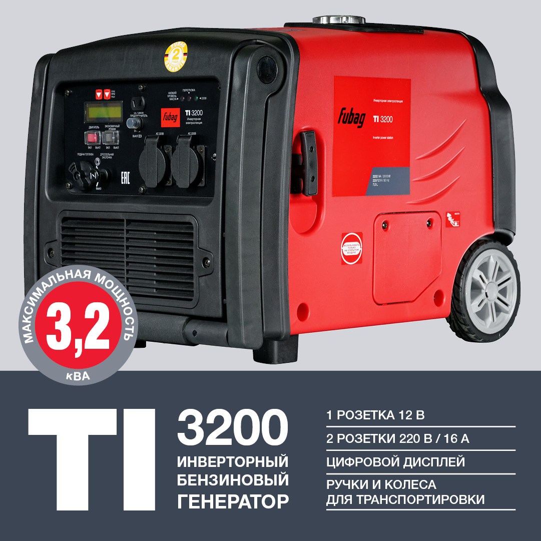 Цифровая электростанция FUBAG TI 3200 - это инверторный генератор, к которому можно подключить приборы общей мощностью 3,2 кВт. Вид топлива - бензин АИ-92.